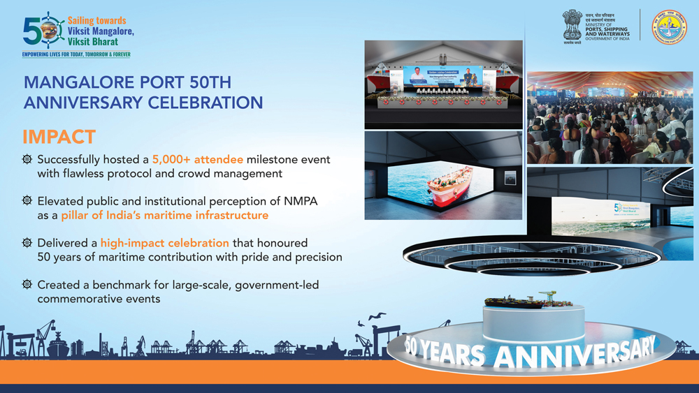 Mangalore PORT 50th Anniversary Celebration Brief Execute a large-scale event to celebrate 50 years of the New Mangalore Port Authority (NMPA), attended by the Hon’ble Union Ministers, Local MP and…